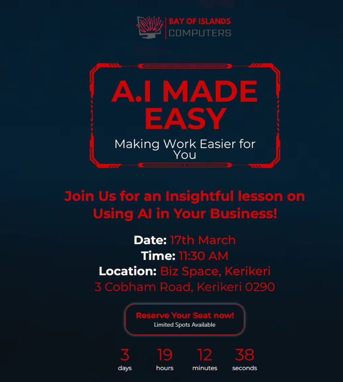 We are pleased to be working with Bay Of Islands Computers to bring workshops that will help your business. Only an hour long so bring your lunch and learn how you can work more efficiently using A.I.